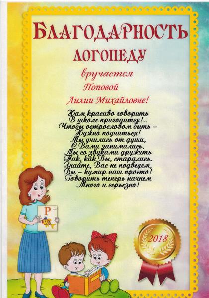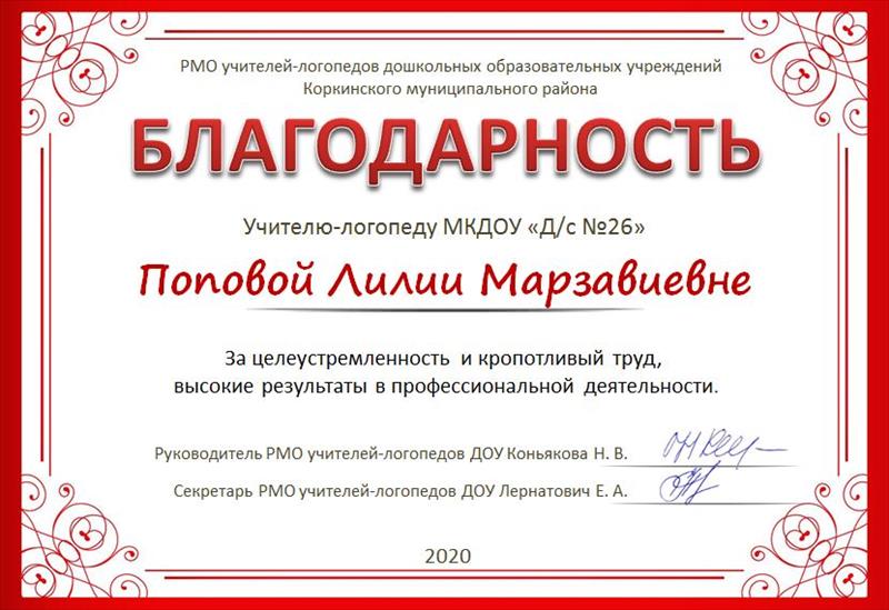 | Благодарность за целеустремленность и кропотливый труд, высокие результаты в профессиональной деятельности. | Ркуоводитель РМО учителей -логопедов ДОУ Коркинского муниципального района | 27.05.2020 | Файл (JPG; 75Кб) |