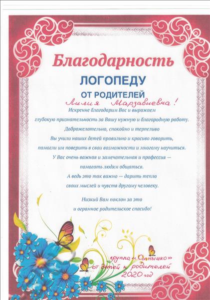 | Благодарность логопеду от родителей | Родительский комитет группы "Солнышко" набор 2018 -2020 | 10.06.2020 | Файл (JPG; 51Кб) |