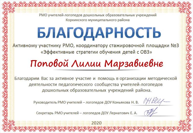 | Благодарность активному участнику РМО, координатору стажировочной площадки № 3 "Эффективные стратегии обучения детей с ОВЗ" | Руководитель РМО учителей - логопедов ДОУ Коркинского муниципального района | 27.05.2020 | Файл (JPG; 92Кб) |